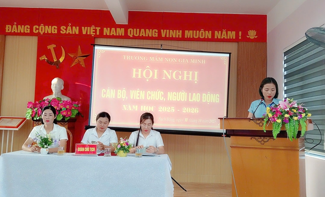 Hội nghị là diễn đàn dân chủ, thiết thực và đầy ý nghĩa, nơi tập thể cán bộ, viên chức, người lao động cùng đánh giá, nhìn nhận những kết quả đã đạt được trong năm học vừa qua, đồng thời thảo luận, đề ra phương hướng, mục tiêu và giải pháp cho năm học mới. Đây cũng là dịp để mỗi thành viên trong nhà trường phát huy tinh thần đoàn kết, trách nhiệm, đóng góp ý kiến xây dựng nhằm nâng cao chất lượng chăm sóc – giáo dục trẻ, khẳng định uy tín và vị thế của Trường Mầm non Gia Minh trong sự nghiệp giáo dục của địa phương. Với tinh thần “Dân chủ – Kỷ cương – Đoàn kết – Sáng tạo – Phát triển”, Hội nghị cán bộ, viên chức, người lao động năm học 2025 – 2026 của Trường Mầm non Gia Minh là bước khởi đầu quan trọng, tiếp thêm động lực mới, niềm tin mới, hướng tới một năm học thành công, chất lượng và nhiều đổi mới tích cực. 🌺