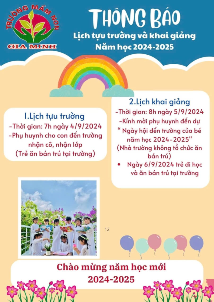Trường Mầm non Gia Minh trân trọng thông báo tới các bậc phụ huynh: Lịch tựu trường và Khai giảng năm học 2024- 2025.
