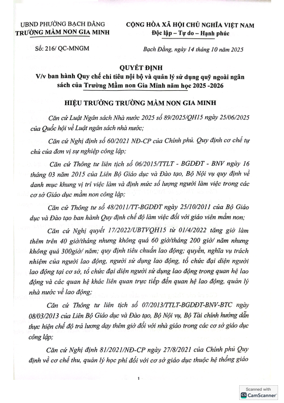 Quyết định V/v ban hành quy chế chi tiêu nội bộ và quản lý sử dụng quỹ ngoài ngân sách của trường Mầm non Gia Minh -năm học 2025- 2026
