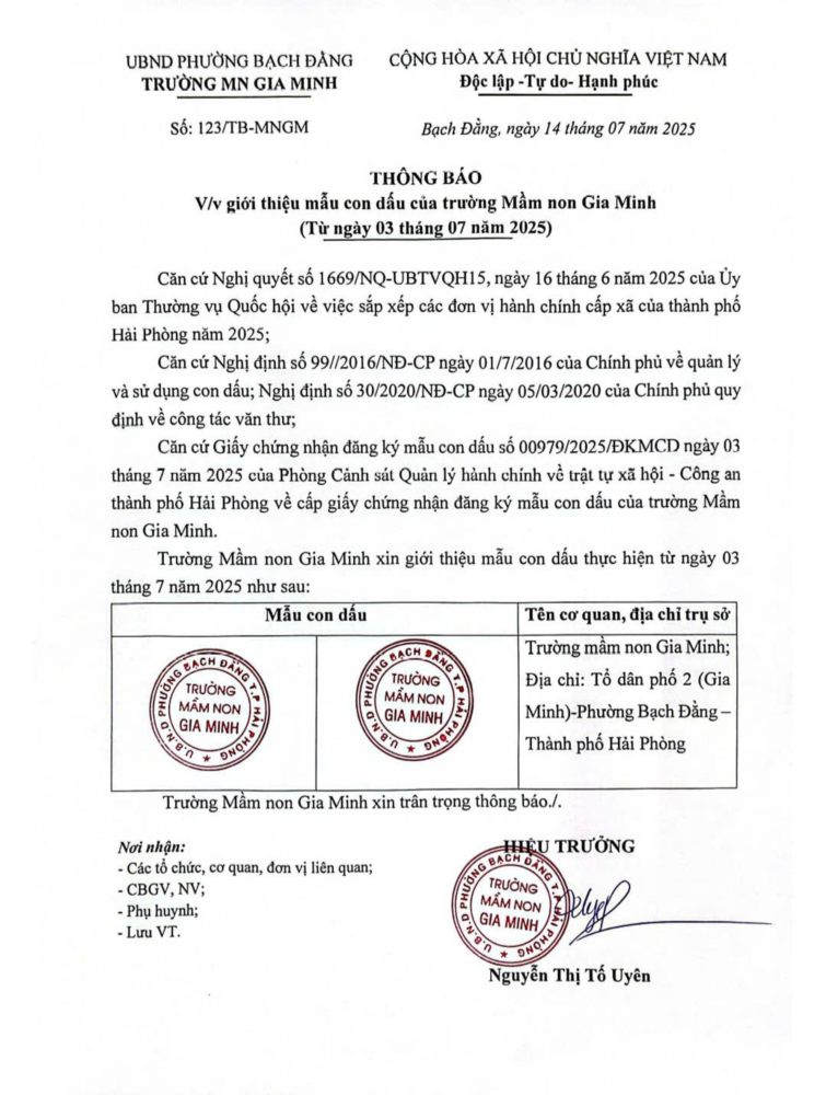 Giới thiệu mẫu con dấu của Trường Mầm non Gia Minh (Từ 03/07/2025)