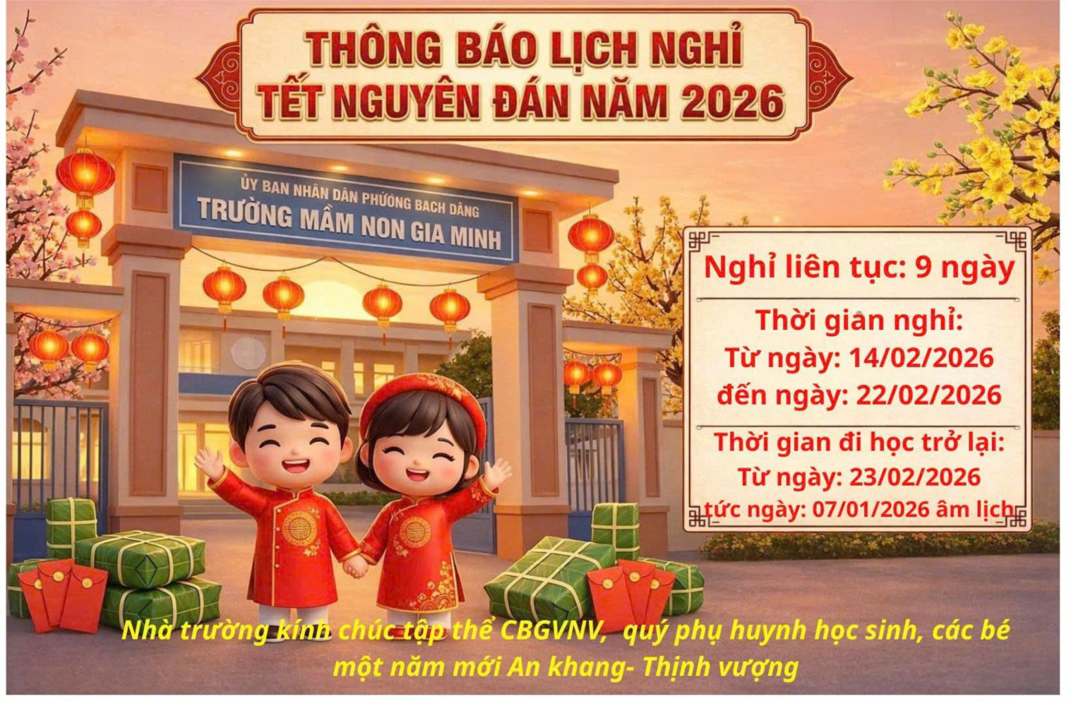 Trường Mầm non Gia Minh thông báo Lịch nghỉ Tết từ 14/02/2026 (27 tháng Chạp) đến hết 22/02/2026 (mùng 6 tháng Giêng). 👉 Các con đi học trở lại vào Thứ Hai, ngày 23/02/2026. Kính chúc quý phụ huynh và các con năm mới an khang – hạnh phúc – bình an!