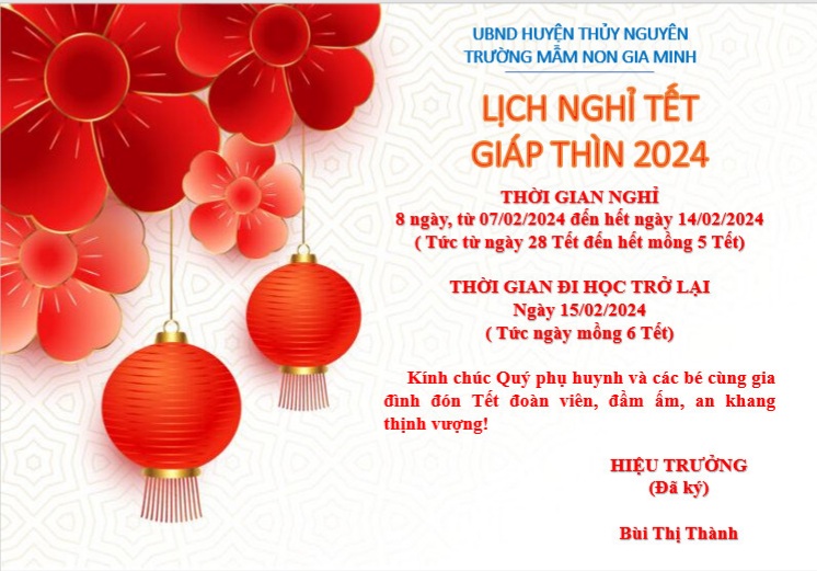 TRƯỜNG MẦM NON GIA MINH THÔNG BÁO LỊCH NGHỈ TẾT XUÂN GIÁP THÌN 2024