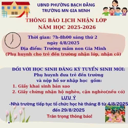 Sở GD&ĐT thành phố Hải Phòng kiểm tra công tác quản lý và thực hiện nhiệm vụ năm học 2025-2026  |  Đoàn thanh niên trường mầm non gia minh tích cực tham gia công tác tuyên truyền bầu cử.  |  Chiều ngày 06/3/2026, Chi bộ Trường Mầm non Gia Minh đã long trọng tổ chức :Lễ kết nạp Đảng viên cho hai quần chúng ưu tú. - Đồng chí: Vũ Thị Tài - Đồng chí Đào Thị Thúy Hằng. Đây là sự kiện có ý nghĩa quan trọng trong công tác xây dựng, phát triển Đảng của Chi bộ nhà trường.  |  Chiều ngày 13/2/2026 trong không khí rộn ràng những ngày cuối năm, Trường Mầm non Gia Minh long trọng tổ chức chương trình Tất niên chào Xuân Bính Ngọ 2026 – khép lại một năm đầy nỗ lực và yêu thương, mở ra mùa xuân mới tràn ngập niềm tin và hy vọng.  |  Trường Mầm non Gia Minh thông báo Lịch nghỉ Tết từ 14/02/2026 (27 tháng Chạp) đến hết 22/02/2026 (mùng 6 tháng Giêng). 👉 Các con đi học trở lại vào Thứ Hai, ngày 23/02/2026. Kính chúc quý phụ huynh và các con năm mới an khang – hạnh phúc – bình an!  |  BỮA TIỆC BUFFET NHỎ – NIỀM VUI TO CHO CÁC BÉ TRƯỜNG MẦM NON GIA MINH 🍓🍓🍓 Hôm nay, Ngày 06/02/2026 Trường Mầm non Gia Minh rộn ràng hơn bao giờ hết với bữa tiệc buffet dành riêng cho các bé yêu . Những bàn tiệc xinh xắn, đầy ắp món ăn quen thuộc – bổ dưỡng – hấp dẫn đã mang đến cho các con một trải nghiệm thật vui và ý nghĩa.  |  Mừng Đảng – mừng Xuân Bính Ngọ năm 2026. Ngày 05/02/2026, Trường Mầm non Gia Minh long trọng tổ chức chương trình “Tết Sum Vầy 2026 mừng xuân Bính NGọ 2026” dành cho các bé. Nhà trường vinh dự đón tiếp đại diện Công an phường Bạch Đằng, các tổ dân phố, Làng văn hóa Đá Bạc, Bí thư Chi bộ, HTX Nông nghiệp Đá Bạc, Đơn vị kết nghĩa Cục Kỹ thuật Hải quân X28, Ban đại diện Cha mẹ học sinh cùng đông đảo phụ huynh tham dự. Chương trình diễn ra sôi nổi với nhiều hoạt động đậm đà bản sắc Tết cổ truyền: trải nghiệm gói bánh chưng, tham gia các trò chơi dân gian,…tạo không khí vui tươi, gắn kết giữa trẻ – phụ huynh – nhà trường. Buổi tối, chương trình văn nghệ chào xuân với nhiều tiết mục đặc sắc mang đến những cảm xúc ấm áp, ý nghĩa.  |  Hướng tới chào mừng Đại hội đại biểu toàn quốc lần thứ XIV của Đảng và chào Xuân Bính Ngọ năm 2026, hôm nay ngày 30/01/2026, Đoàn Thanh niên Trường Mầm non Gia Minh – phường Bạch Đằng, thành phố Hải Phòng đã phối hợp cùng nhà trường tổ chức hoạt động lao động vệ sinh tổng thể khuôn viên trong và ngoài sân trường.  |  Trân trọng kính mời: Quý đại biêu, khách quý cùng toàn thể các bậc phụ huynh tham gia chương trình "XUÂN YÊU THƯƠNG- TẾT SUM VẦY 2026" Không khí Tết đang rộn ràng tại Trường Mầm non Gia Minh 🎉 Chuỗi hoạt động trải nghiệm ý nghĩa với: 🥬 Gói bánh chưng 🎶 Văn nghệ 🖌️ Viết thư pháp, trang trí đào 🎲 Trò chơi dân gian & gian hàng ẩm thực 💖 Nơi các bé được trải nghiệm Tết cổ truyền, gắn kết yêu thương cùng gia đình và nhà trường.  |  Ngày 21/1/2026, các trường mầm non Ngũ Lão, Minh Đức, Gia Đức, Gia Minh, Minh Tân đã long trọng phối hợp tổ chức chuyên đề trải nghiệm cho trẻ khối 5 tuổi với chủ đề “Dòng sông quê em – Bạch Đằng Giang yêu dấu”. Chương trình vinh dự đón tiếp lãnh đạo Sở Giáo dục và Đào tạo thành phố Hải Phòng, đại diện các phòng ban phường Bạch Đằng, các cơ quan công an, quân đội, các trường mầm non trong toàn thành phố, đơn vị kết nghĩa, quý phụ huynh cùng toàn thể các bé khối 5 tuổi.