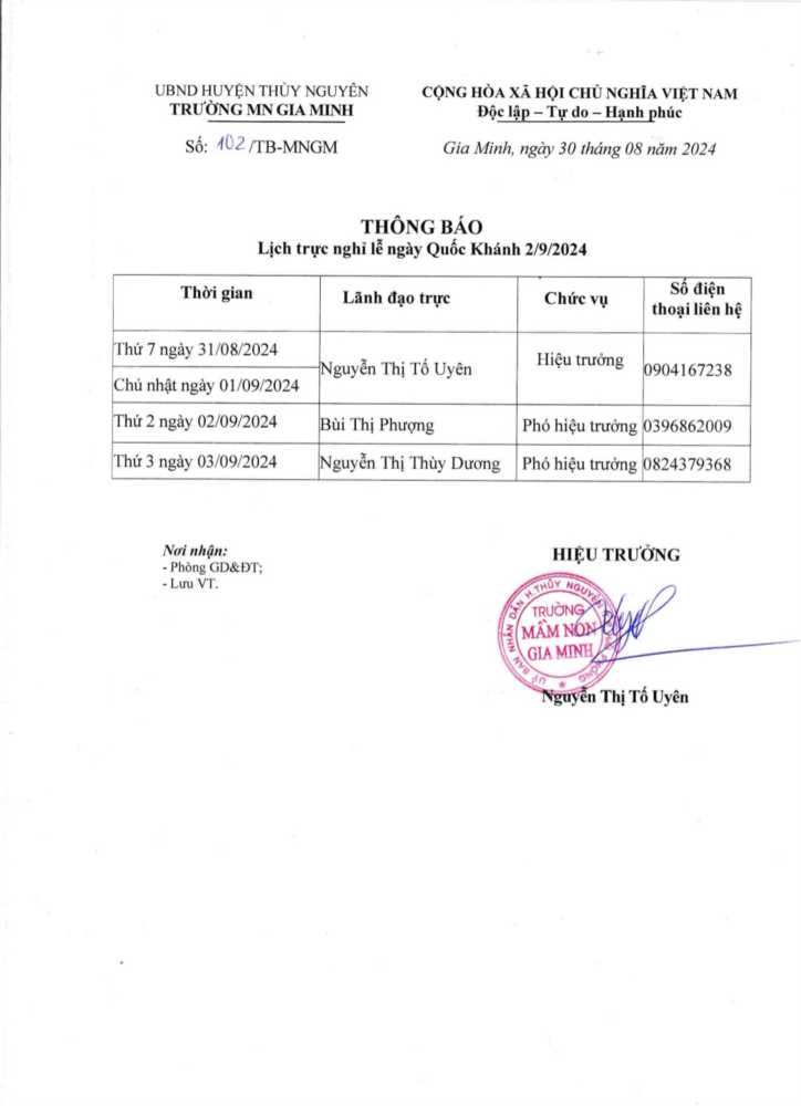 Thông báo lịch trực nghỉ Lễ Quốc Khánh 2/9/2024