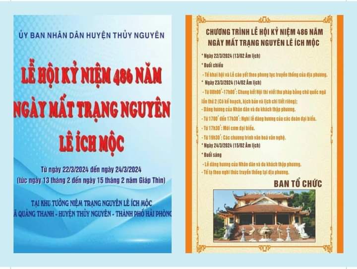 Trân trọng kính mời quý phụ huynh cùng toàn thể nhân dân tới tham dự Lễ hội " Kỉ niệm 486 năm ngày mất Trạng nguyên Lê Ích Mộc ( thời gian từ 22/03/ 2024 đến 24/ 03/ 2024) tại khu tưởng niệm trạng nguyên Lê Ích Mộc- xã Quảng Thanh- h. Thuỷ Nguyên- TP. Hải Phòng.