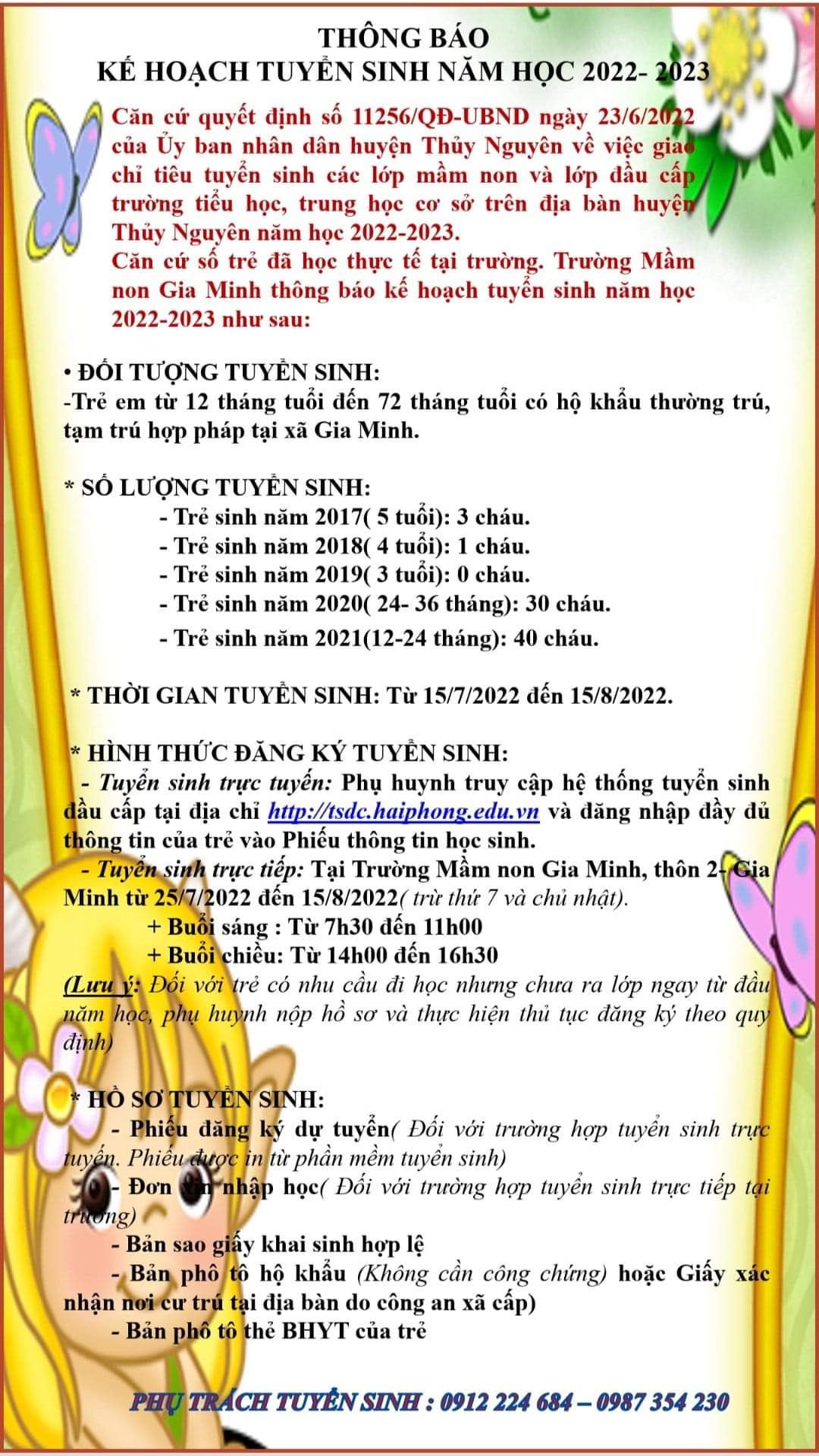 THÔNG BÁO KẾ HOẠCH TUYỂN SINH NĂM HỌC 2022 - 2023 Trường Mầm non Gia Minh kính gửi các bậc phụ huynh Thông báo Kế hoạch tuyển sinh năm học 2022 - 2023! Trân trọng!