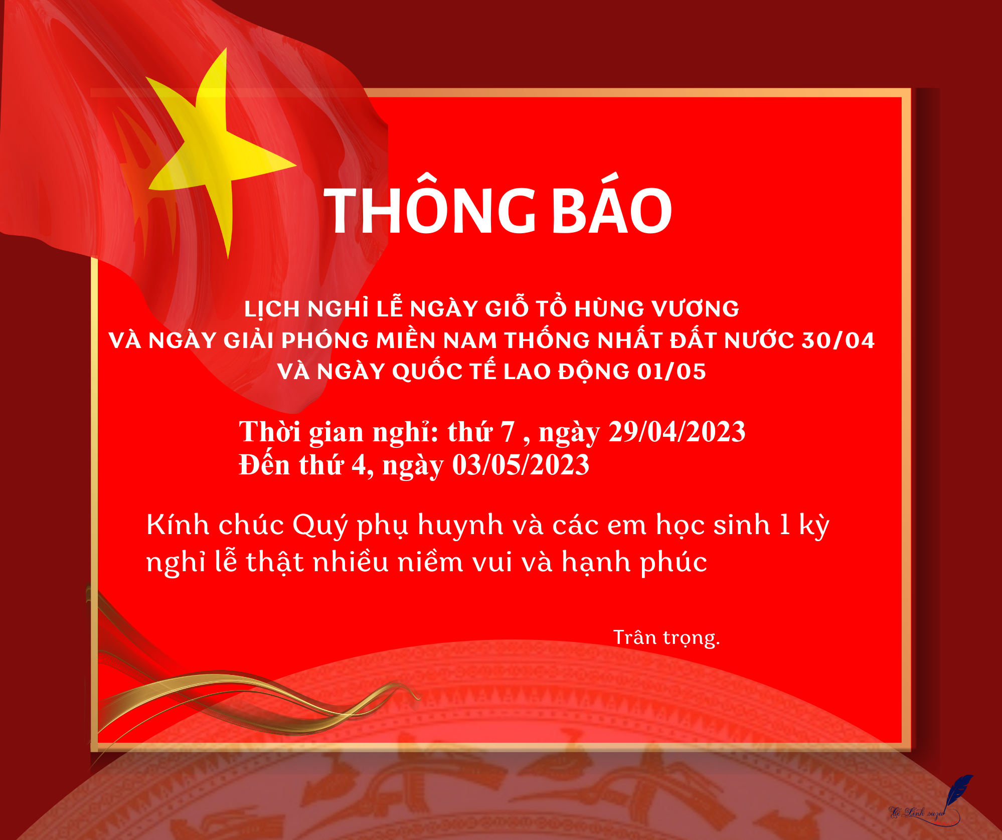 THÔNG BÁO LỊCH NGHỈ LỄ 30/4 - 01/5 VÀ NGÀY GIỖ TỔ HÙNG VƯƠNG (10/3) ÂM LỊCH